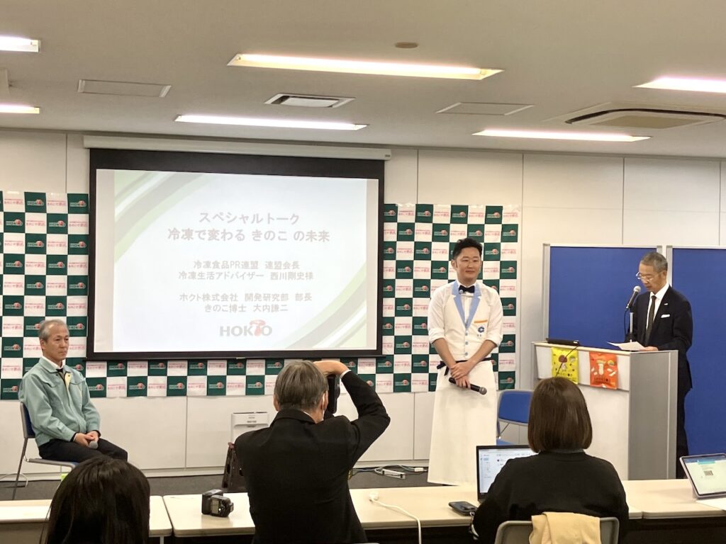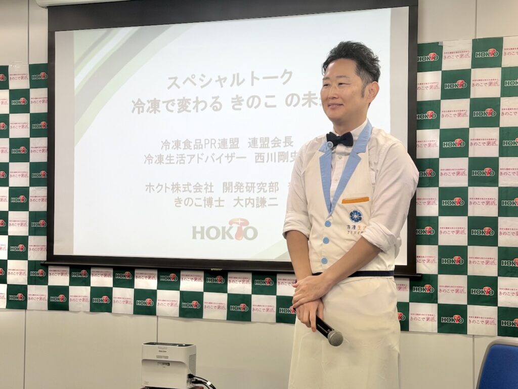 きのこの研究、開発、生産、販売を一貫して行う「国内最大手のきのこ総合企業」であるホクト株式会社は、2025年11月21日に冷凍きのこ新製品発表会を開催しました。この発表会の企画提案および当日のトークセッションに冷凍生活アドバイザー西川剛史が関わらせていただきました。