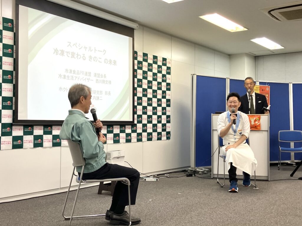 ホクト開発研究部長できのこ博士「きのこバカセ」の大内氏と、冷凍生活アドバイザー西川にて冷凍技術ときのこの新しい可能性についてトークセッションを行いました。